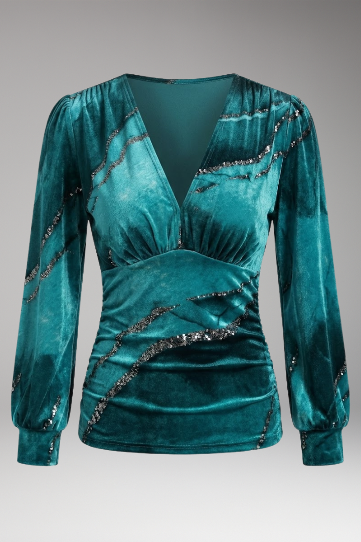 Women’s V-Neck Blouse with Ruched Waist and Long Sleeves