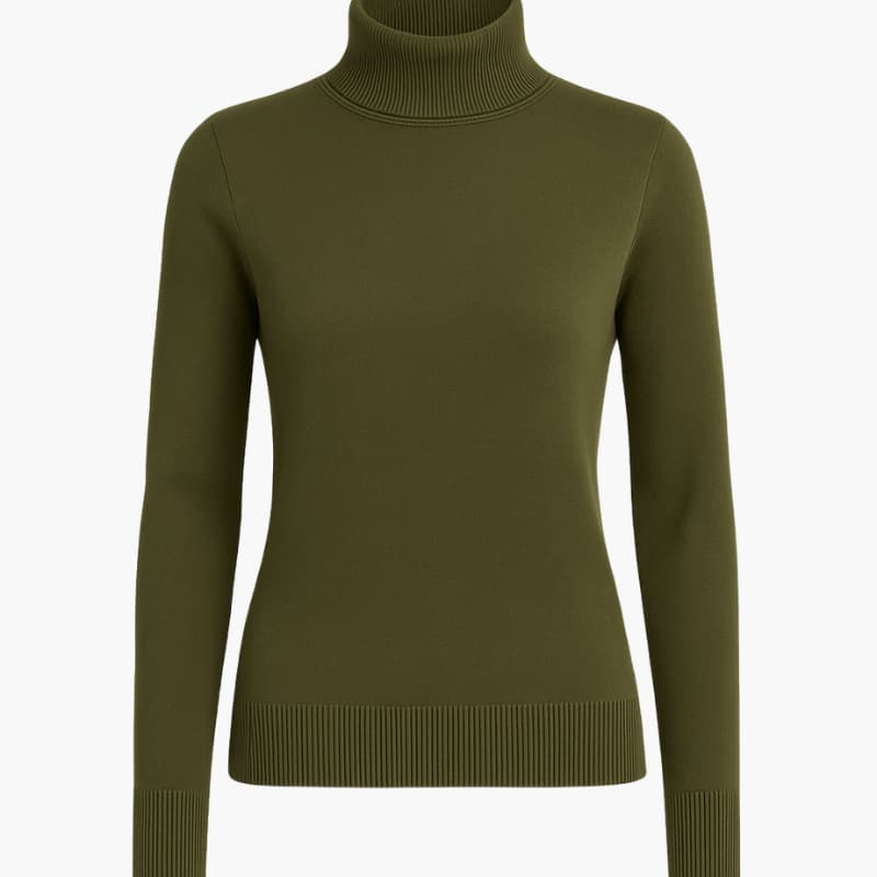 • Neckline: High turtleneck design offering structured coverage around the neck.